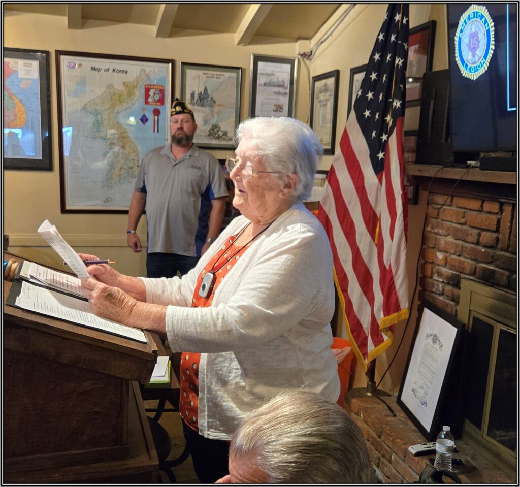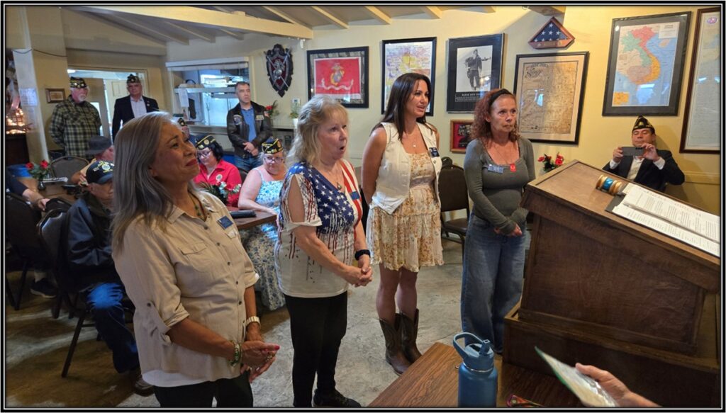 American Legion Auxiliary Unit 365 Officers. L-R: Sgt-at-Arms Lyn Leahy, 2nd Vice Kathleen McDermed, 1st Vice Mandy Sakemi, President Colleen Collazo.Not present:Secretary/Treasurer – Karen Bowman, Historian – Marge Ernst, Chaplain – Monica CamargoAmerican Legion Auxiliary Unit 365 President Colleen Collazo accepts the Gavel from Auxiliary Installing Officer Lois Cornish.Auxiliary Installing Officer Lois Cornish reads the Oath of Acceptance to the 2025-26 Auxiliary 365 Incoming Officers. Lois assured the membership that those officers not present for the installation were still eligible as they were re-elected and had already sworn the oath of acceptance previously.