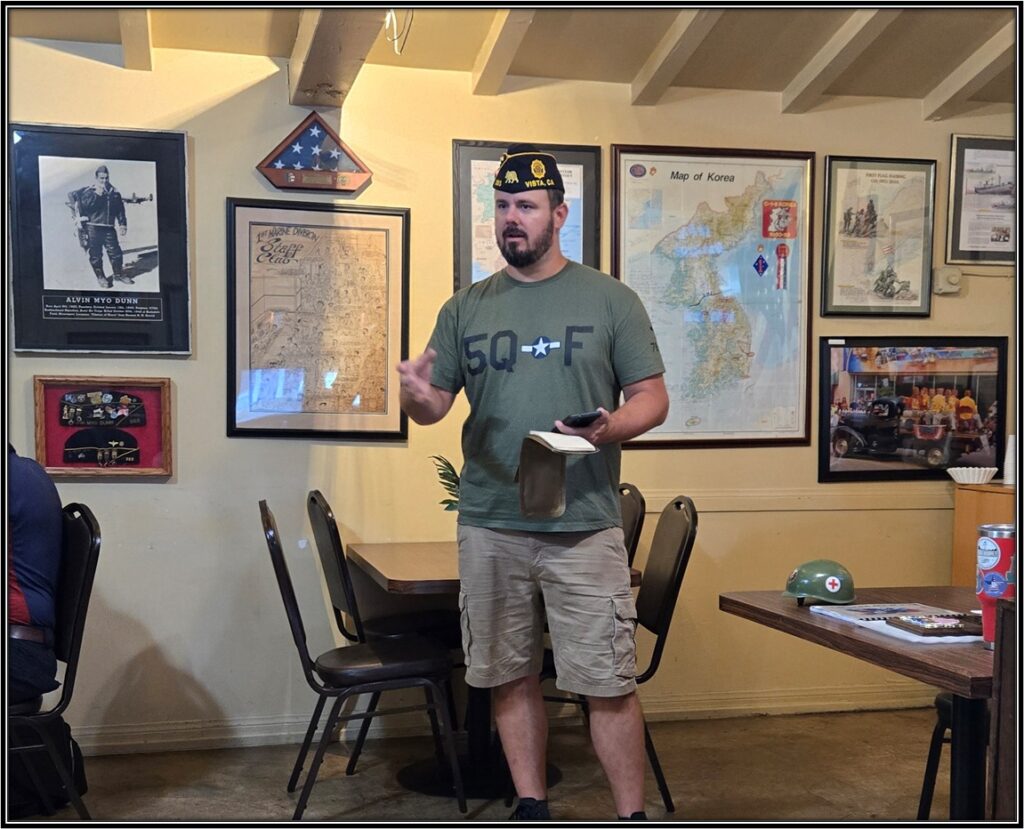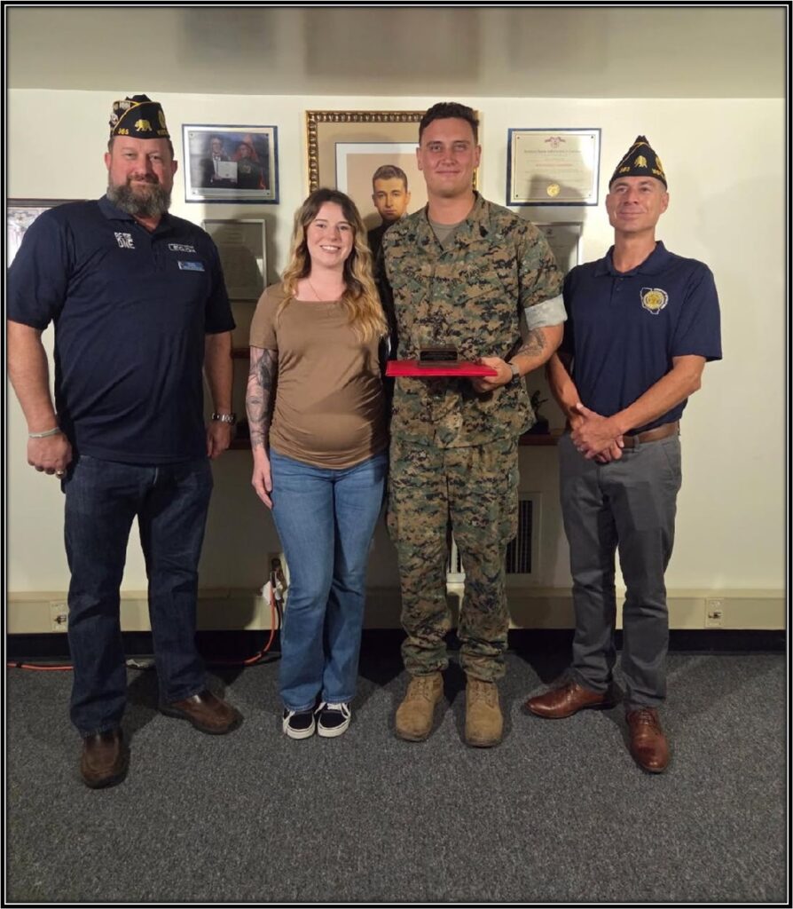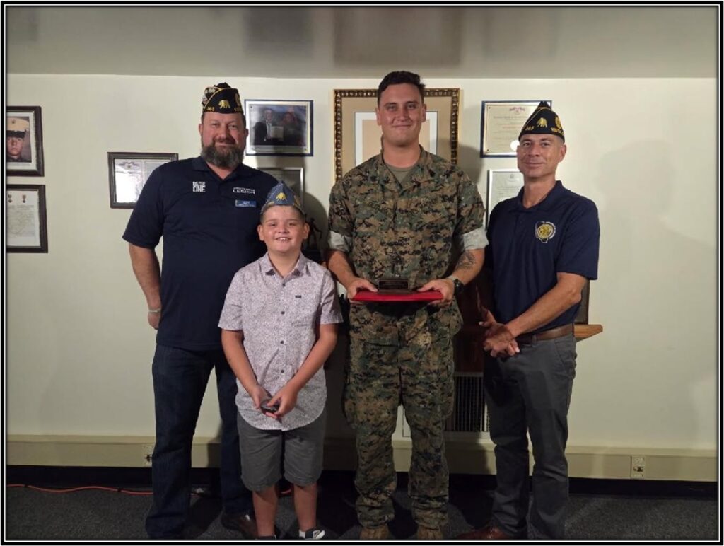 On Friday August 8, 2025, at the School of Infantry, Camp San Onofre, Marine Corps Base, Camp Pendleton California, an awards ceremony was held for the outstanding member of the class. (L-R):Commander Tom Moore, Combat Instructor Infantry Unit Leaders Course Awardee Sergeant Bettler and wife and Jr. Past Commander Brad Sakemi.