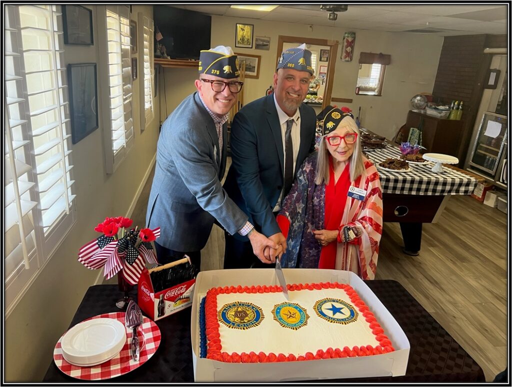 Vic Martin, District 22 Commander; Shaun Butler, District 22 SAL Commander; Linda Sunberg, District 22 Auxiliary President cutting the cake at the Installation Ceremony.