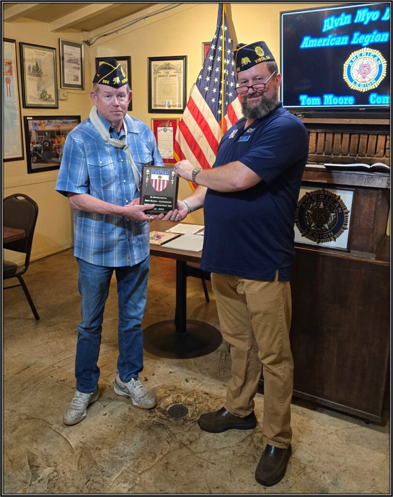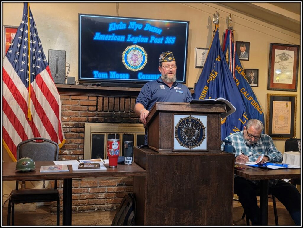 Post 365 Commander Tom Moore brings the July General Meeting to order. A busy meeting that addressed Boys State, and a full on report by the Post Financial Officer Pat Burgess. We are a little down in the cash department, but the last Steak Night was well attended which helped out. Please attend the meetings and stop in and help support the post in the Club Room. At right, Mike Stevenson tries to keep up with Tom’s rapid-fire delivery. Hang in there, Mike.Past Commander Bret Olson is presented a long overdue plaque by Commander Tom Moore for his contribution to Post 365 as Commander during 2022-23. Thank you Bret for all your hard work.Paul Krueger gives his monthly history lesson: The month of July is named after Julius Ceasar, as is August after Augustus Ceasar. And if that isn’t enough to get you thinking – all that manipulation by the Ceasars led the month of October, which was originally the eight month to be kicked up to the 10th month. The Ceasars’ got their hands into everything (even Pizza). Also, on July 16, 1945 the first nuclear bomb was tested. A month later the bombs on Hiroshima and Nagasaki brought an end to WWII.