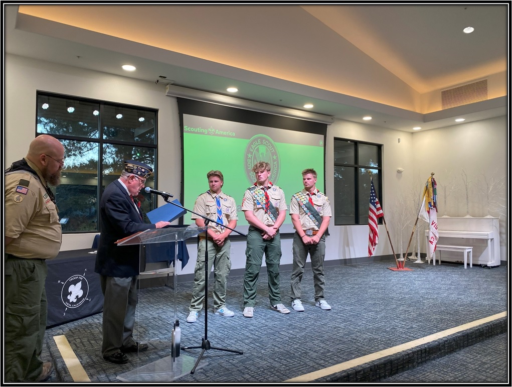 Terry Moxley, Charter Organization Representative, presents Awards at the Court of Honor of Scouting America Troop 709 held on Tuesday, July 29th at the Methodist Church of Vista. The Eagle Scouts receiving the awards are Carter Conlee, Patrick Conlee and Logan Johnston.
