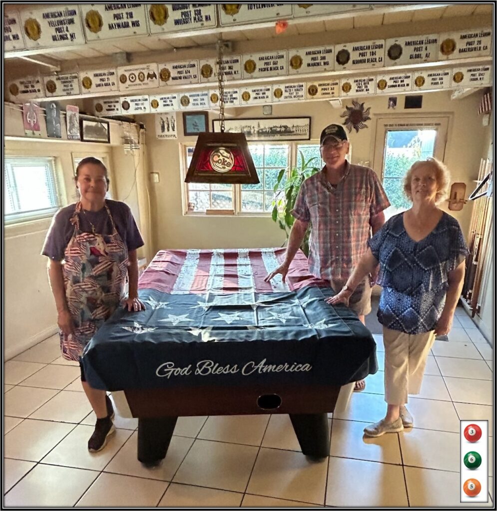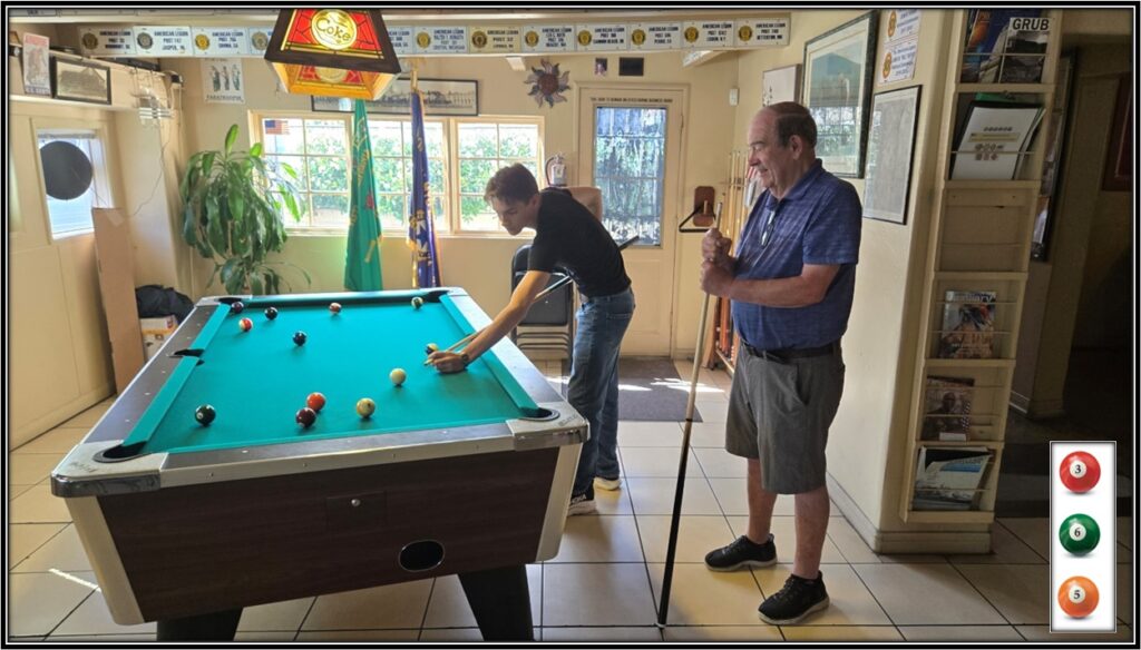 Check out the new Post pool table cover donated by VFW Auxiliary. (L-R) Auxiliary President Monica Camargo, Trustee Rick Huff and Secretary/Treasurer Karen Bowman. Come on in and shoot a game or two.John Keenan looks on as his Grandson, Shane, teaches him few lessons. John likes pool and the Mets, not looking good, old friend.