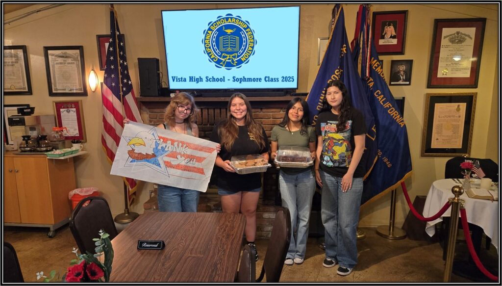 Vista High School California Scholarship Federation (CSF), Sophomore Class of 2025 came to American Legion Post 365 in Vista on Saturday with a donation of cookies, brownies, and assorted baked goods for the members. The CSF has made donations to American Legion Post 365 for the past 4 years. We thank them for their donations and for their participation in events that “Thanks Veterans for their Service”. L-R: Addi, Zarena, Sophia and Larissa, members of the CSF with their donation. The California Scholarship Federation, Inc. is a nonprofit organization whose mission is to recognize and encourage academic achievement and community service among middle and high school students in California. For more information click on this LINK
